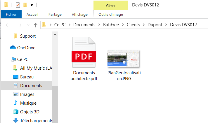 Sélectionnez un document à l'emplacement choisi (dans notre exemple Documents\BatiFree\Clients\Dupont\Devis DVS012/Documents architecte.pdf) et cliquez sur Ouvrir.