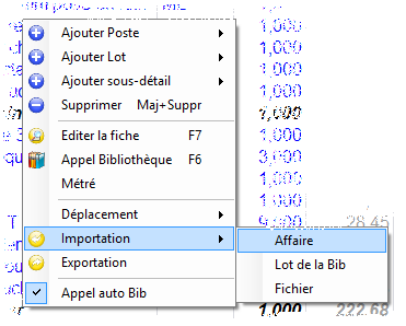 Lorsque vous êtes dans l'étude de l'affaire dans laquelle vous voulez importer, placez vous sur la ligne où vous voulez insérer, faites clic-droit pour faire apparaître le menu contextuel et choisissez Importation/Affaire.
