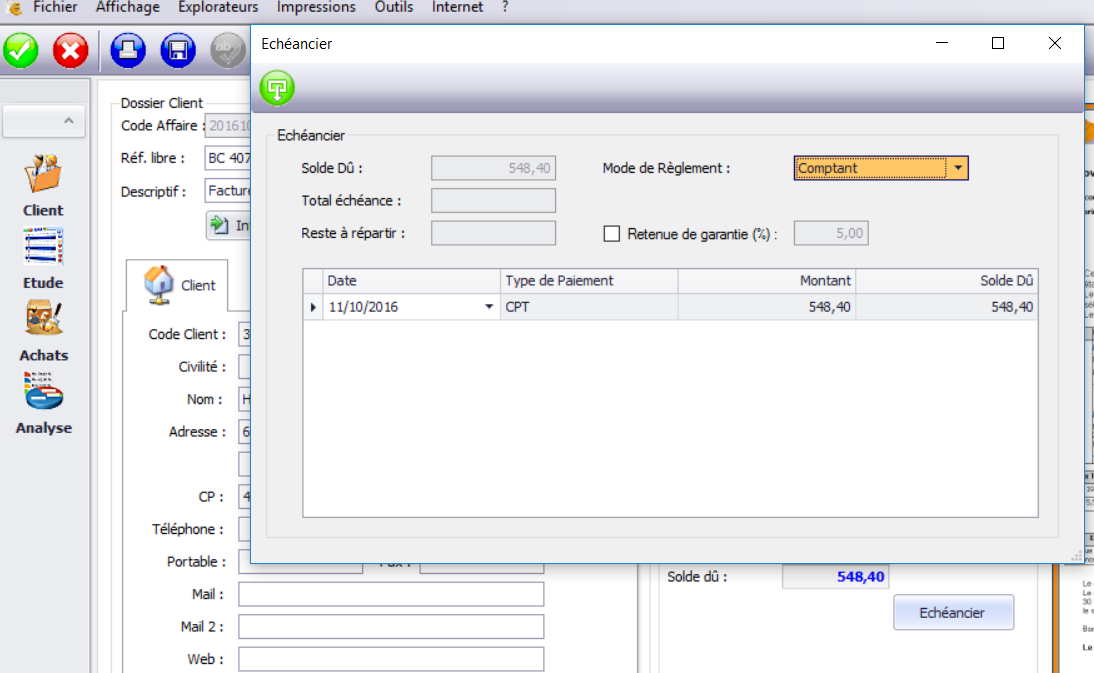 Dans chaque facture au niveau du dossier client, cliquez sur le bouton Echéancier et sélectionnez le mode de règlement.