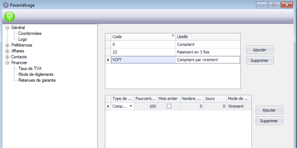 La fenêtre des modes de règlement est composée de deux parties :